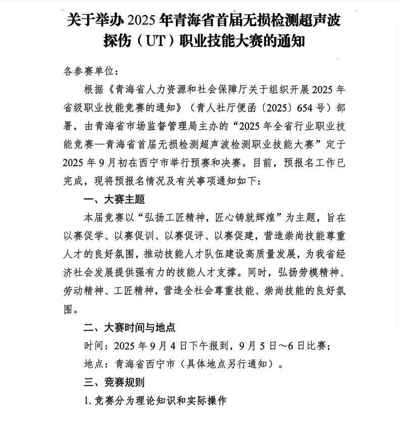 關(guān)于舉辦2025年青海省首屆無損檢測超聲波檢測探傷職業(yè)技能大賽的通知